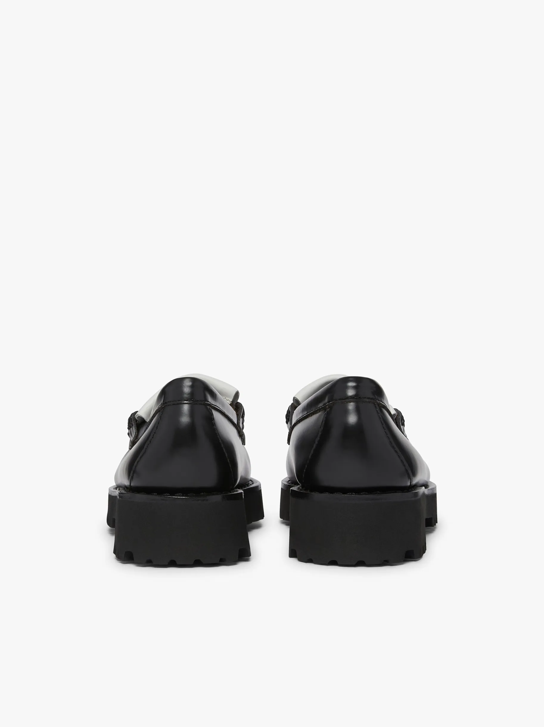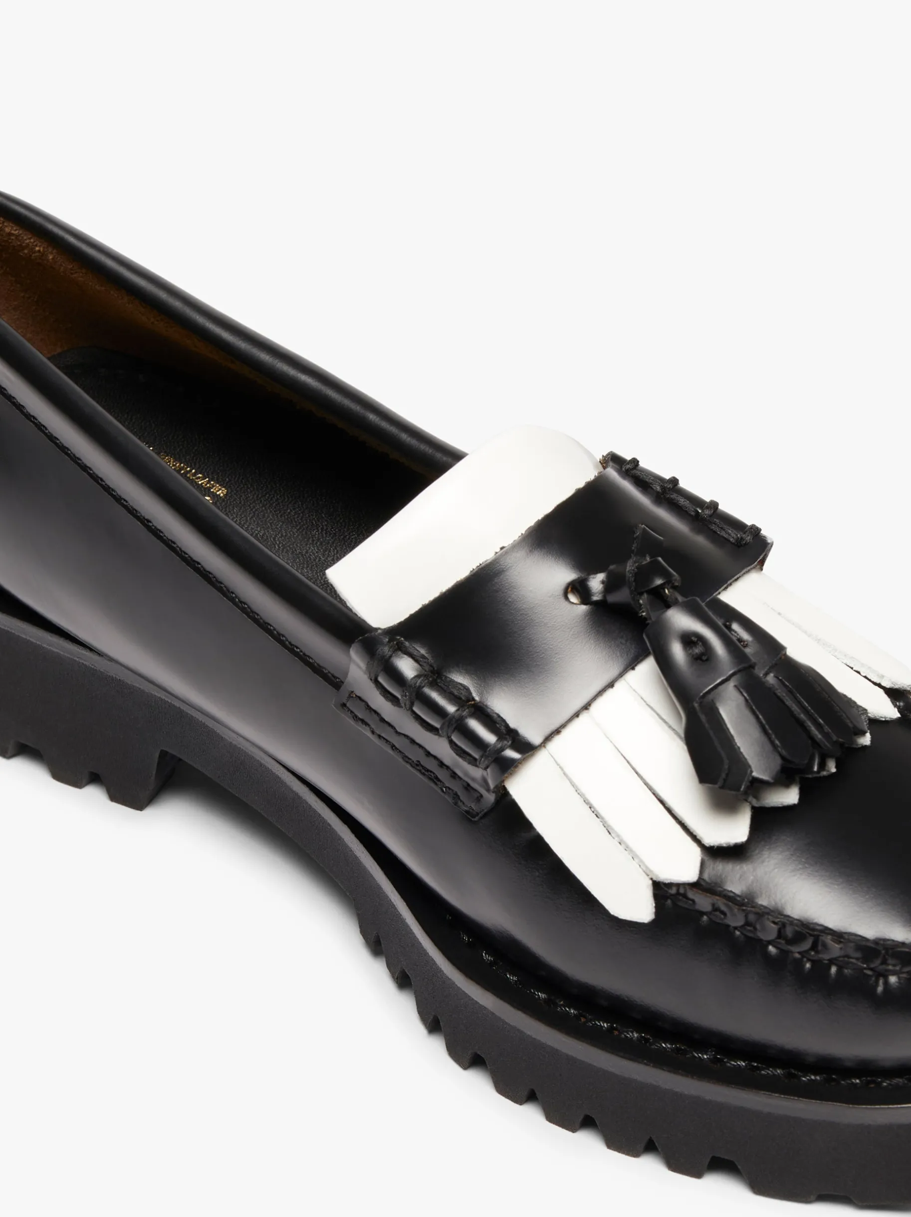 A sharp monochromatic style amplifies the attitude of these Weejuns 90s loafers. Hand-crafted in El-Salvador from a polished moc leather, the traditional Esther Kiltie tassel returns on the chunky Weejuns 90s profile. The contrasting black & white fringe detailing adds a lively finish to this classic design. Match these with an all-black outfit to draw just the right amount of attention to these statement loafers.