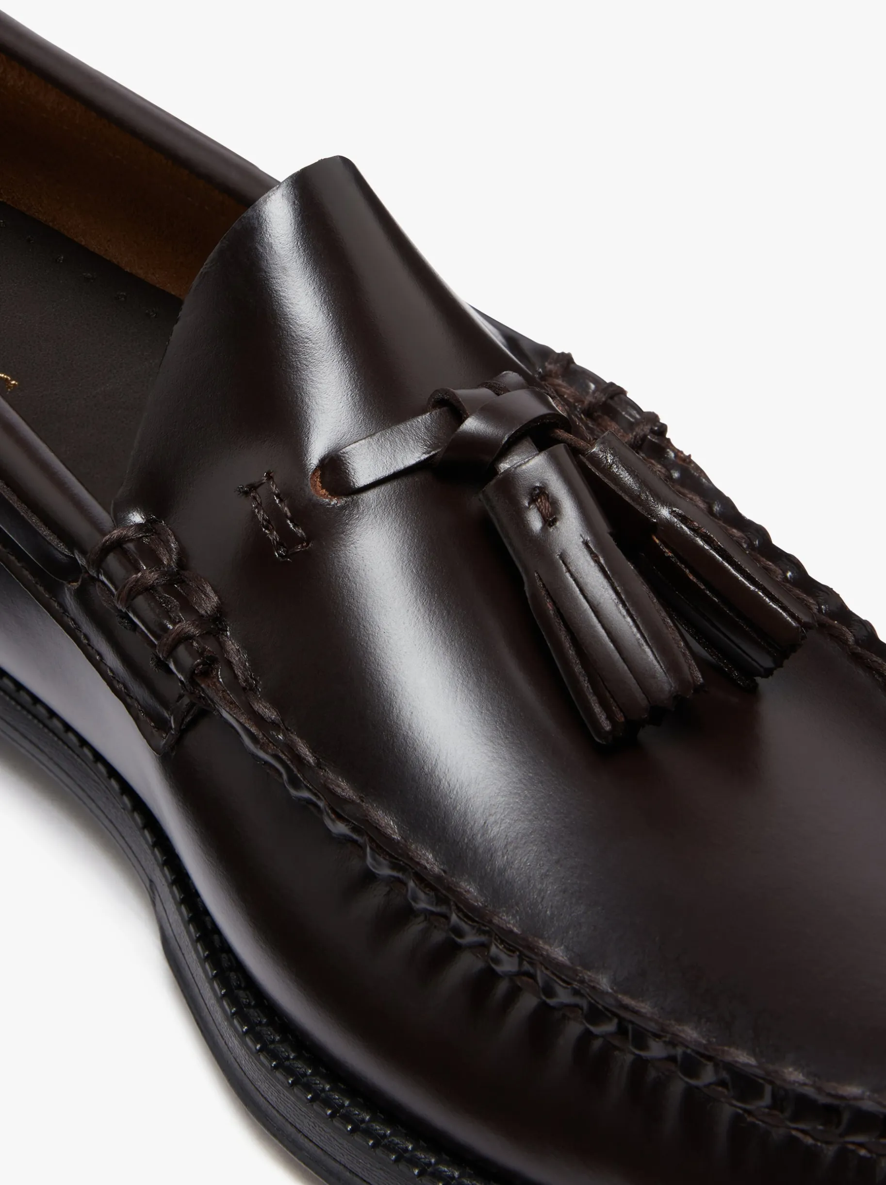 The Easy Weejuns Larkin Tassel Loafers in Chocolate Leather are a heritage inspired design. An evolution of the loafer style G.H.BASS first introduced to the world in 1936. Featuring a traditional hand-stitched construction, tonal waxed thread, and signature tassel detailing that nods to generations of timeless style. Unlined for natural breathability yet cushioned for modern comfort, they balance old-world craft with modern ease. Finished with strengthened welt stitching and a flexible all-weather rubber sole, these tassel loafers are built to last. Perfect for pairing with tailored suits, chinos, or well-worn denims. A true classic with all the craft and character that defines G.H.BASS