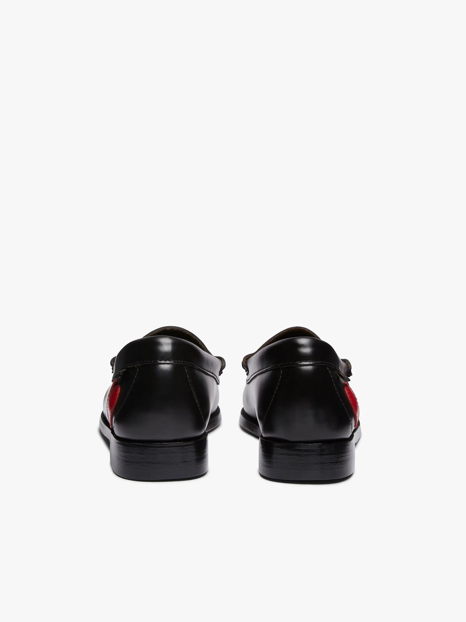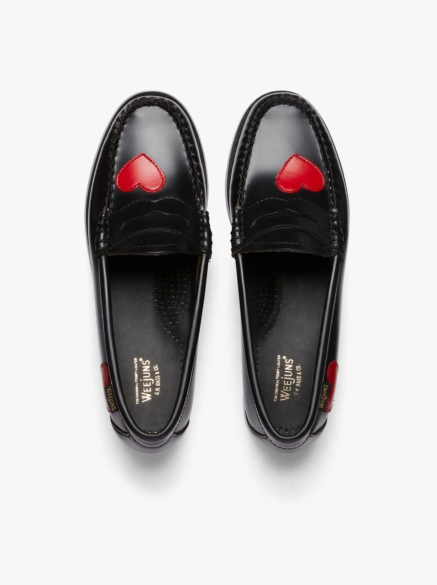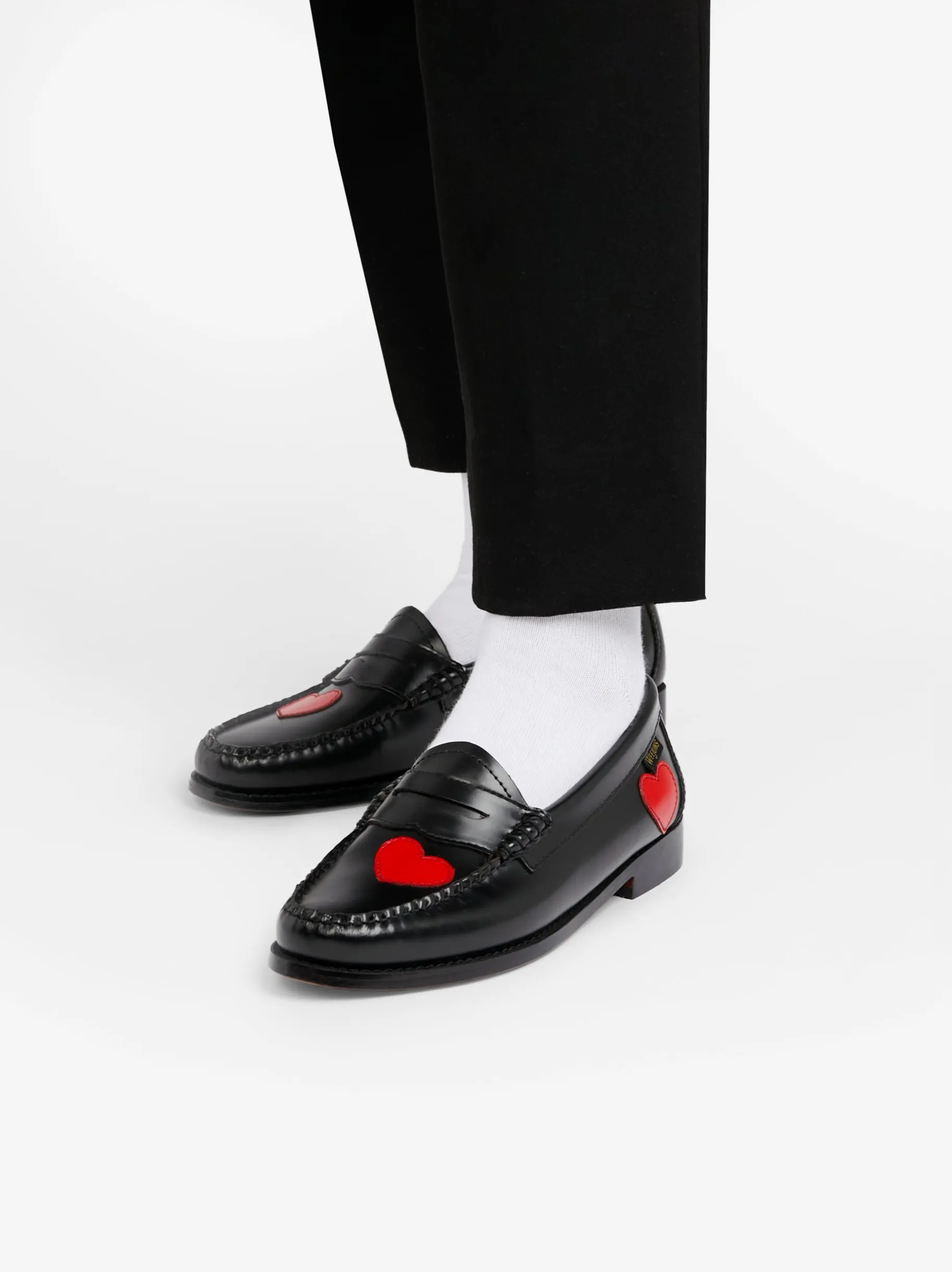Share the love with the women’s Penny Love Weejuns, the classic black penny loafers with adorable symbolic, leather hearts. In polished black leather, slip-on design and hand-stitched seams. Crafted from premium polished leather, the deep red hue is of the love heart complemented by a sleek black backing for a striking yet sophisticated finish. Perfect for pairing with tailored trousers, casual denim, or even a midi skirt, these black and red leather loafers offer effortless versatility and timeless appeal. We also offer a wide variety of other womens loafers, including colours such as black, brown, tan, navy, white, silver and green.