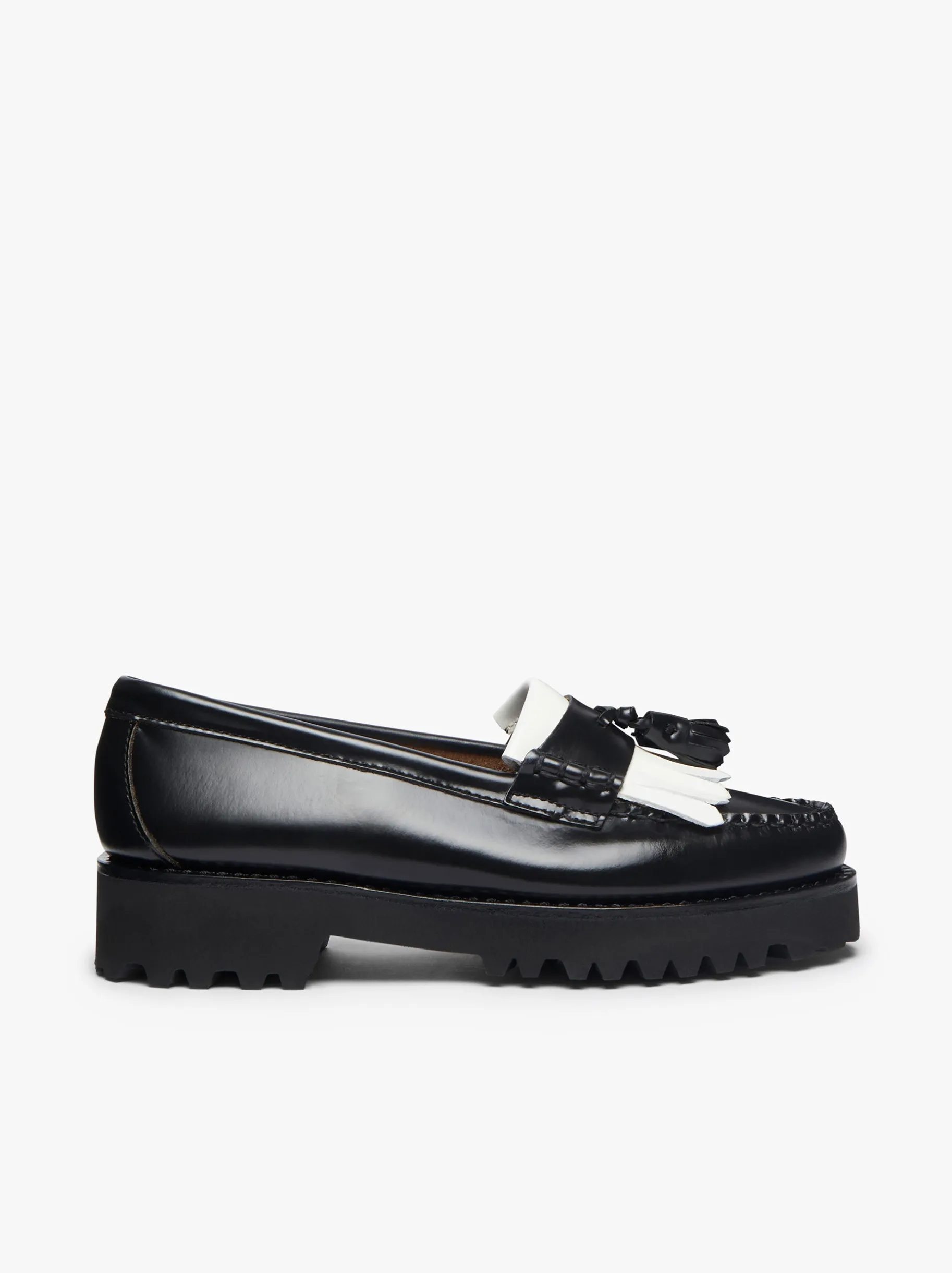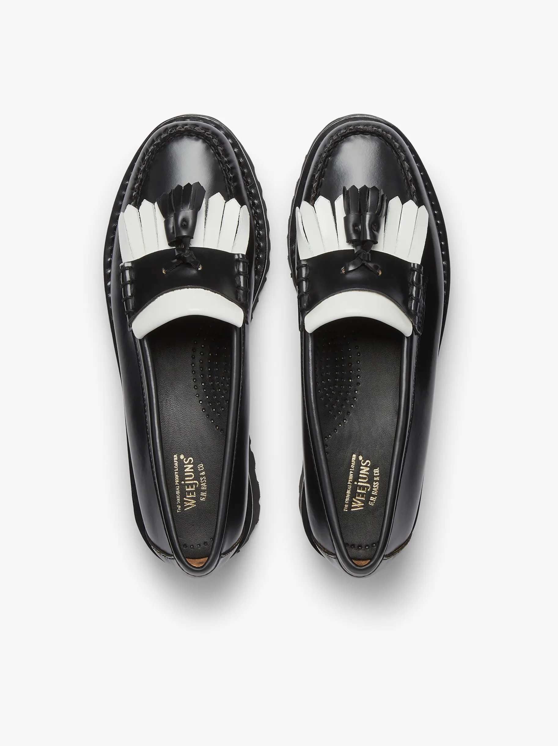 A sharp monochromatic style amplifies the attitude of these Weejuns 90s loafers. Hand-crafted in El-Salvador from a polished moc leather, the traditional Esther Kiltie tassel returns on the chunky Weejuns 90s profile. The contrasting black & white fringe detailing adds a lively finish to this classic design. Match these with an all-black outfit to draw just the right amount of attention to these statement loafers.