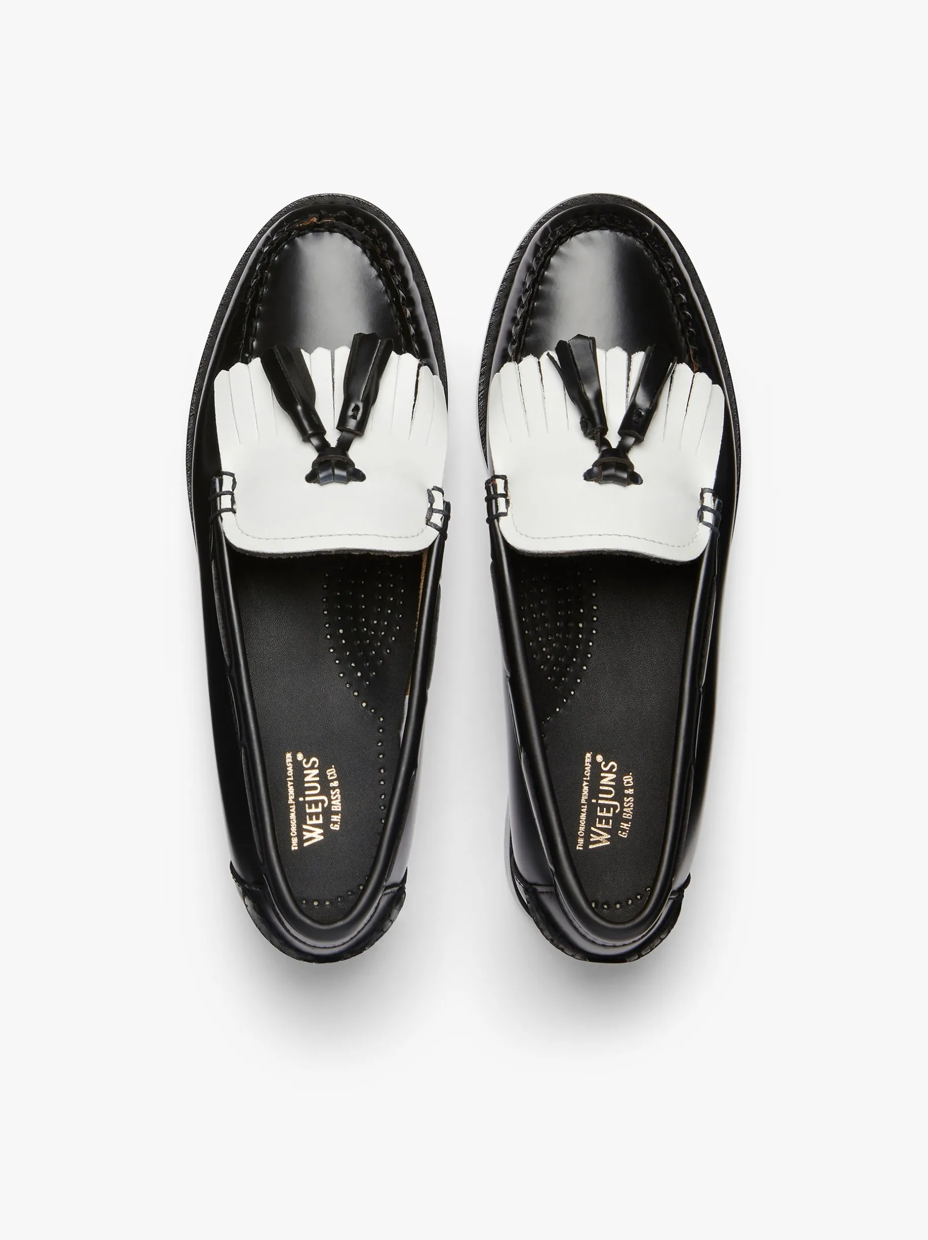 Hand-crafted from smooth high-shine black & white leather, these women’s Weejuns feature a fringed kiltie and a pair of decorative tassels at the front. Accompanied by a black polished heel and base. This style brings a timeless detailing to a dynamic design. There’s just no beating a true classic and these slip-on Weejuns Esthers are the very definition of the word.
