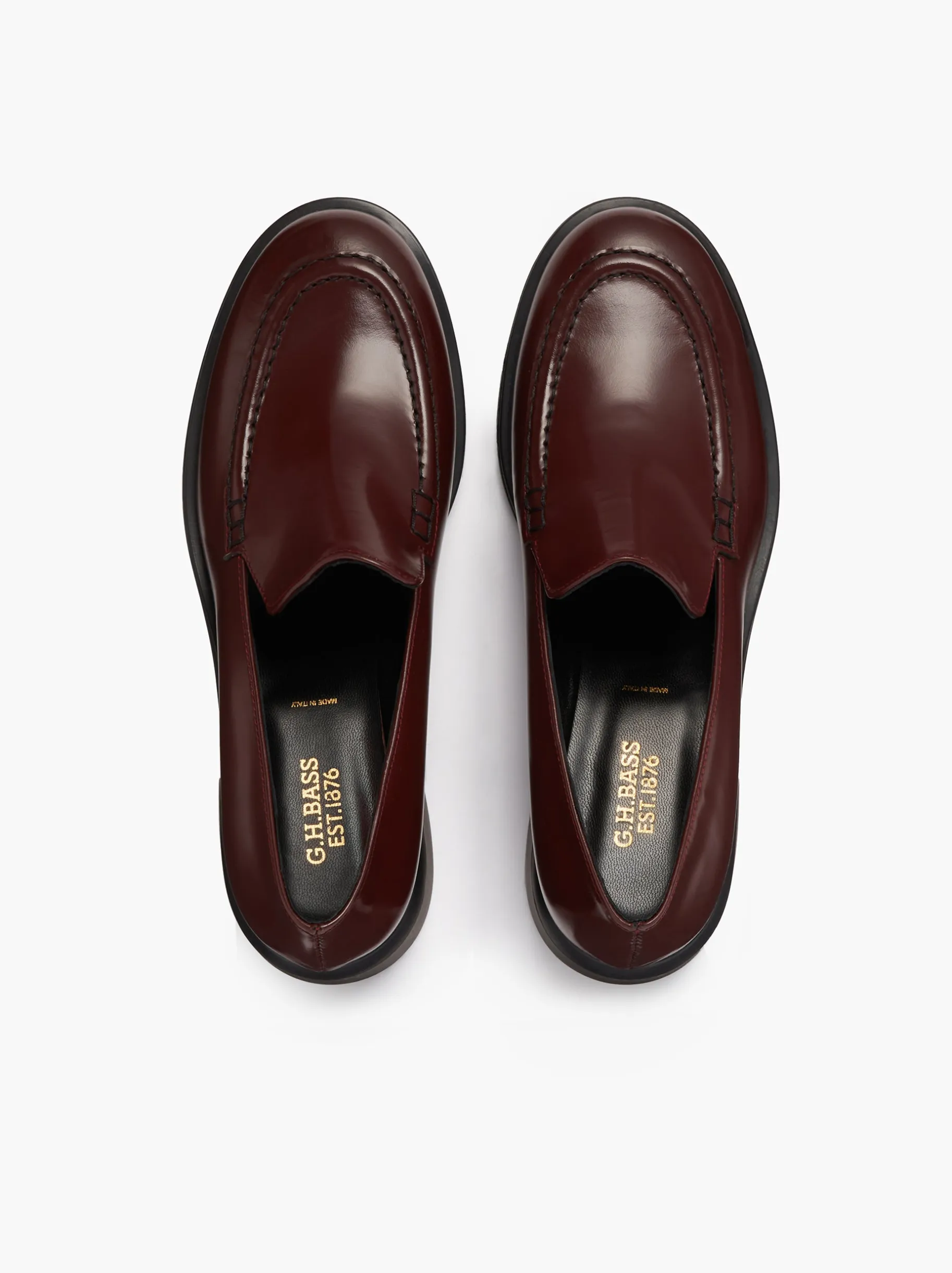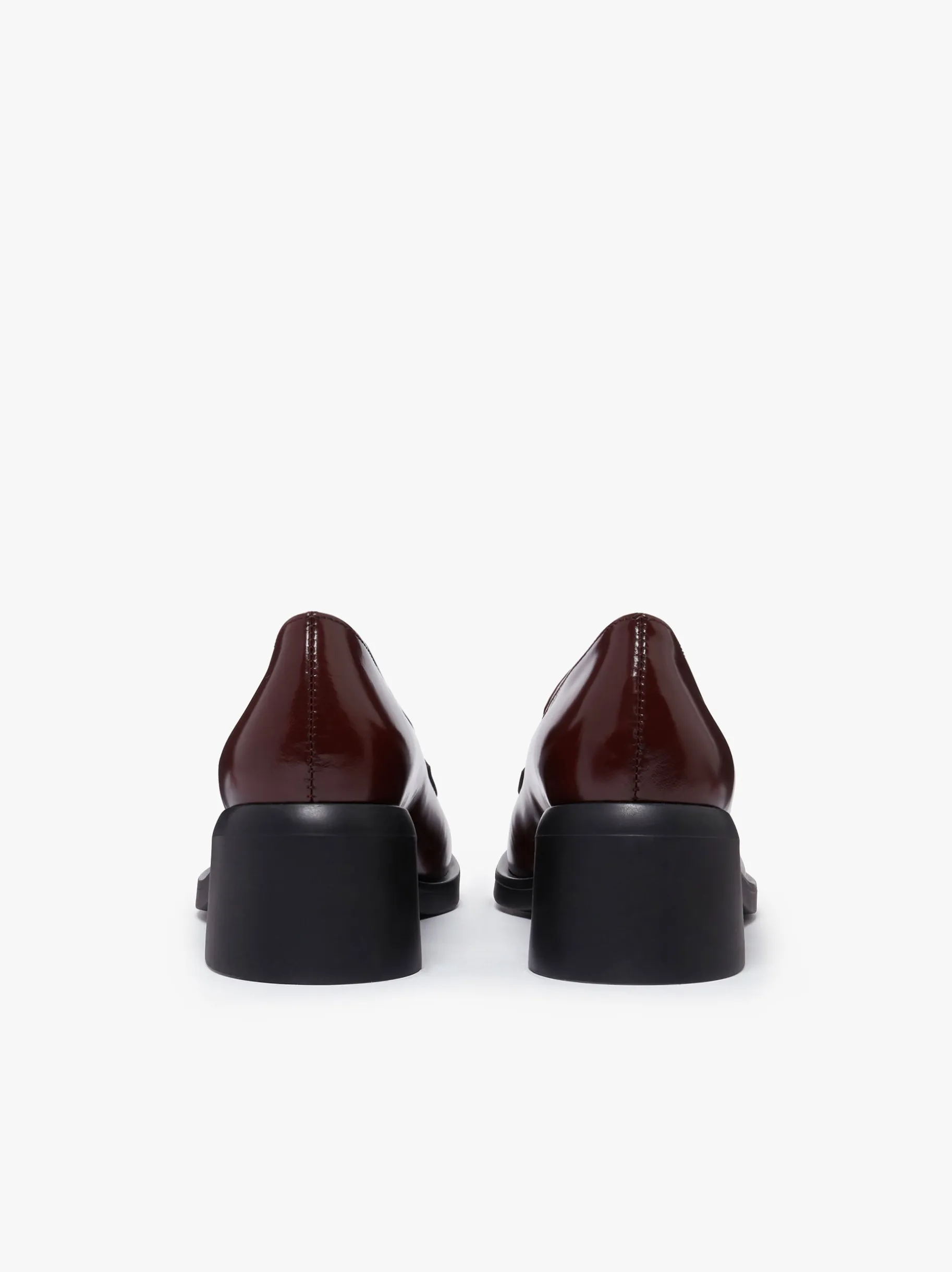 TheAnna Venetian loafer in polished wine leather exudes a rich, sophisticated charm. Omitting the penny strap for a minimalist finish, this loafer is designed to make a statement. The double stitching technique and sturdy block heel ensure it balances elegance with durability. Inside, the ultra-soft sock lining provides lasting comfort, while the rubber sole offers reliable grip and traction. Try styling these heels with tailored trousers or an A-line skirt. For a striking look, team them with earthy tones like olive or camel, or go bold with contrasting shades like navy or blush to create a stylish outfit that will take you from the office to your more upscale evening outings.