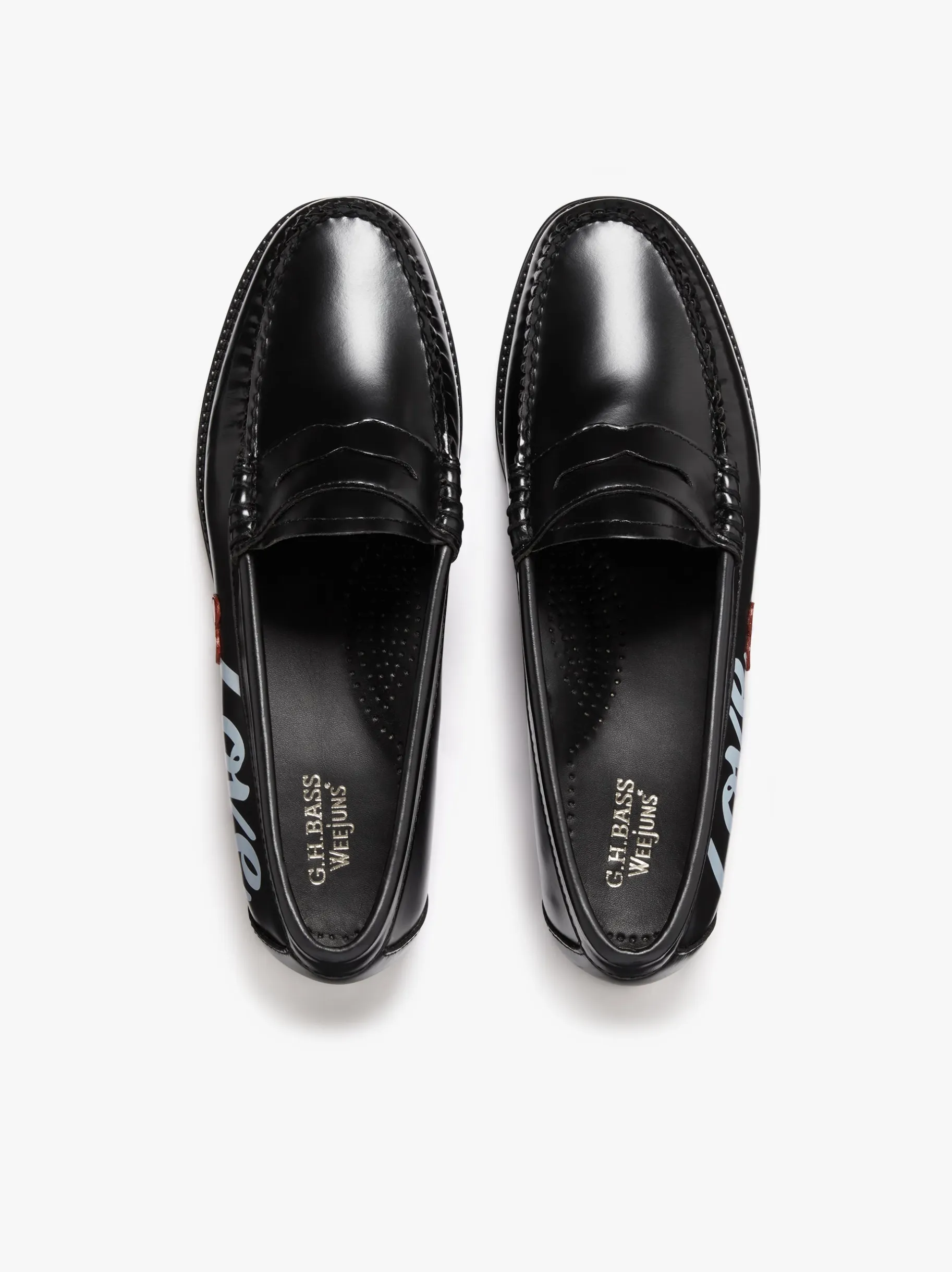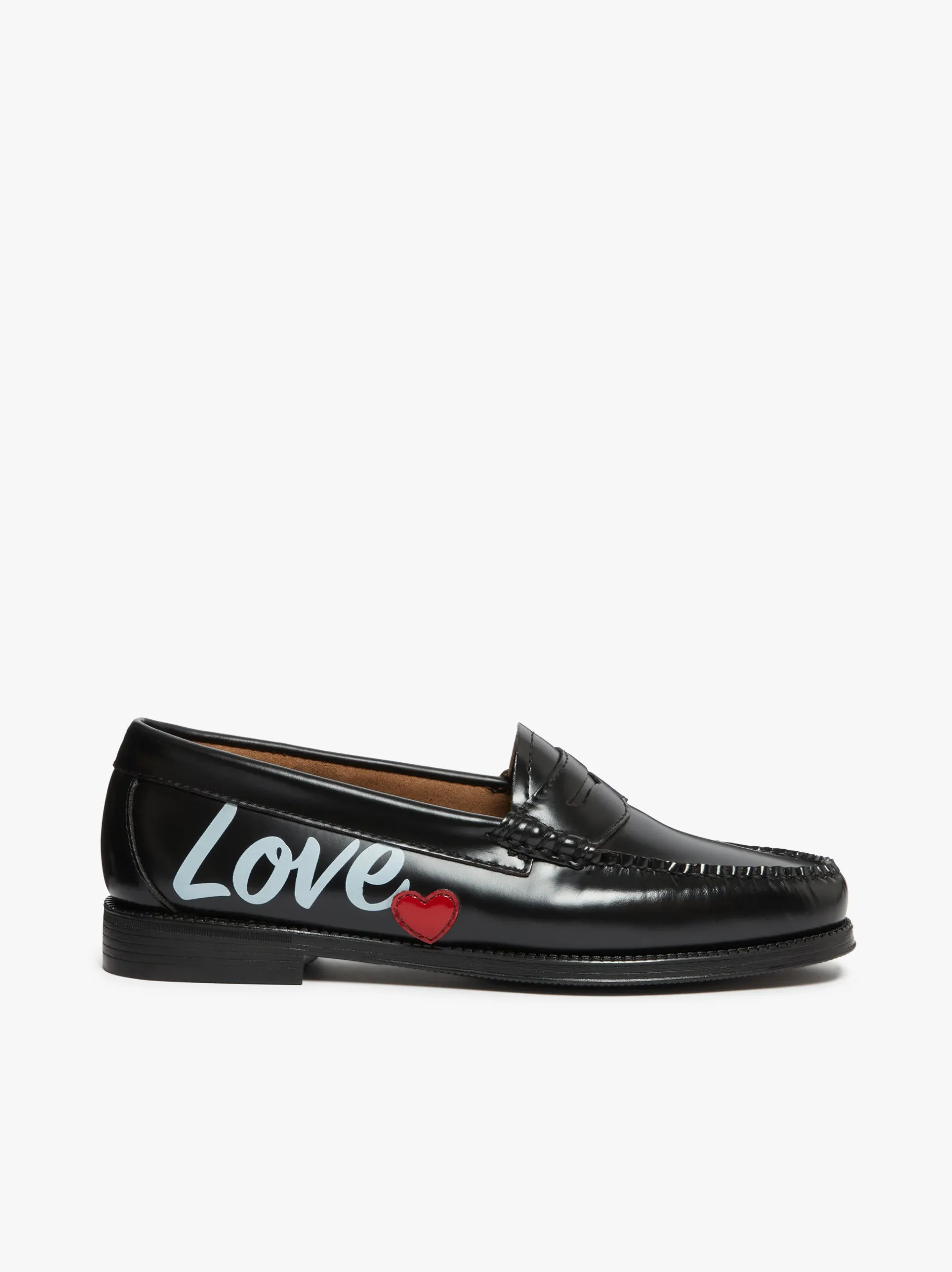 Add a little love to your walk with the Easy Weejuns Penny Love Note Loafers in Black Leather. Crafted by hand in polished black leather, these playful loafers feature a screen-printed red heart and the word “love” for a charming, whimsical finish. Lightweight, unlined, and cushioned, they combine heritage craftsmanship with modern comfort. Durable, water-resistant rubber soles make them perfect for all-year-round wear. Pairing with everything from tailored trousers to casual denim. A classic women’s penny loafer with extra love and extra charm.
