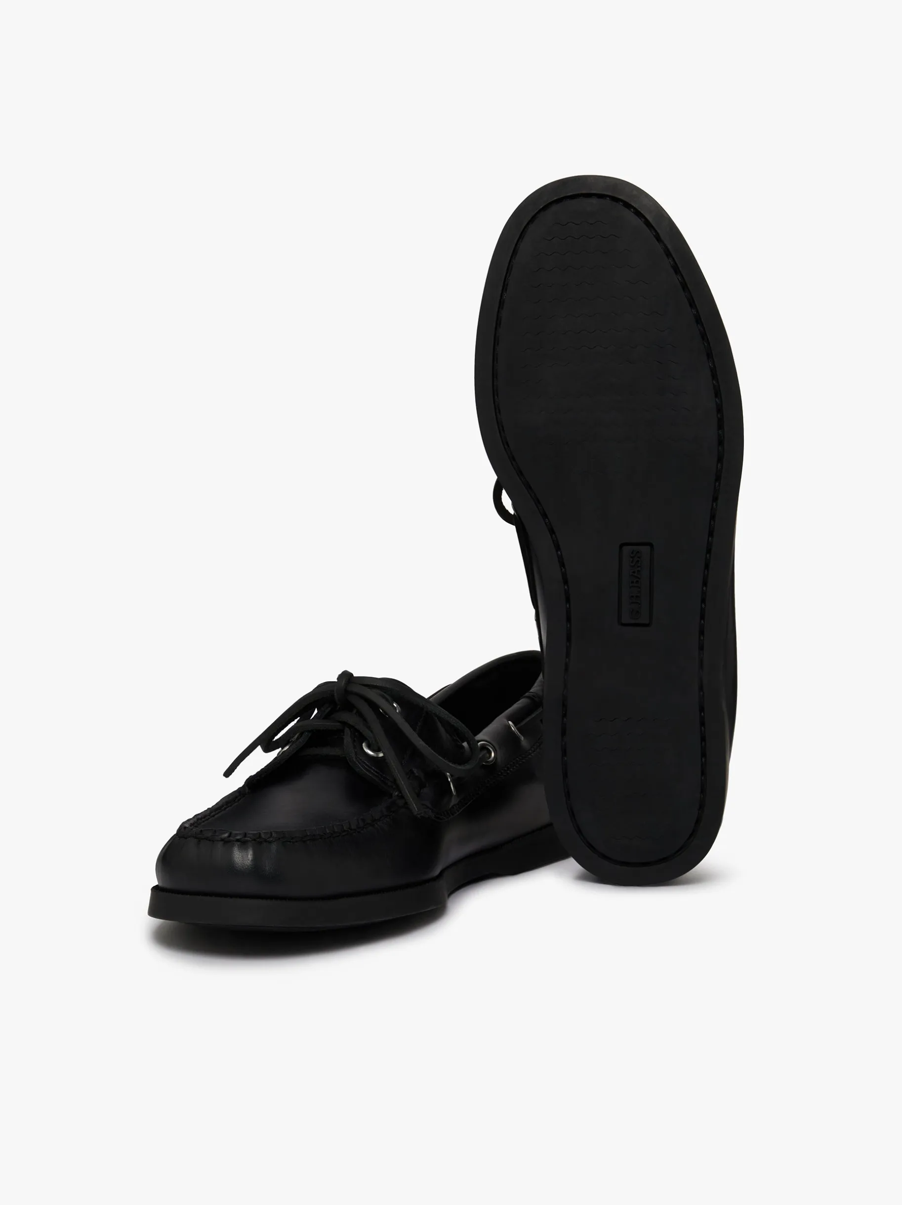 Meet the men’s Jetty II 2 Eye Boat Shoe in black pull-up leather, crafted for summer style and durability. These hand-sewn boat shoes feature leather laces for a secure fit, a plush cushioned insole, and a premium leather insock for all-day comfort, while the water-resistant rubber sole ensures excellent grip. known for its rich, natural finish, pull-up leather develops a unique patina over time, enhancing its character while maintaining durability and flexibility. For a laid-back summer look, pair these boat shoes with linen trousers and a short-sleeve shirt, or dress them up with tailored chinos and a light-coloured blazer for warm evening gatherings.