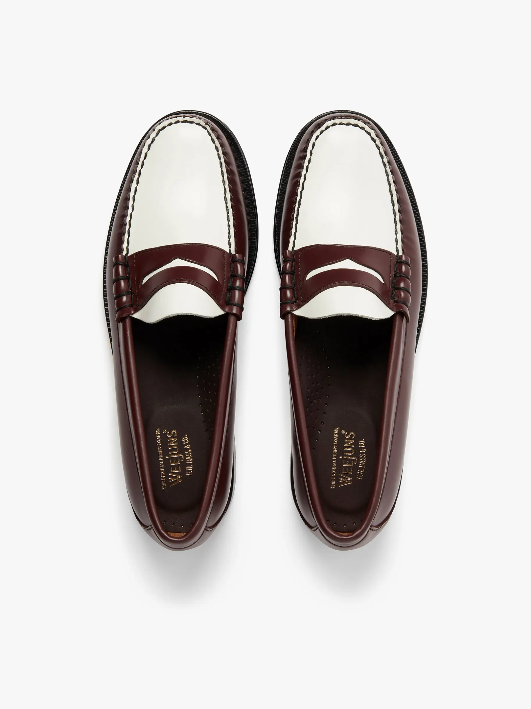 The Larson Moc Penny is a playful two-tone style crafted from smooth polished leather in contrast wine and crisp-white shades. Set on the classic black leather outsole and hand-stitched using heritage construction techniques for time-tested quality and comfort, this bold yet refined shoe works well with navy tailoring or with trousers that have a checked patterned finish.