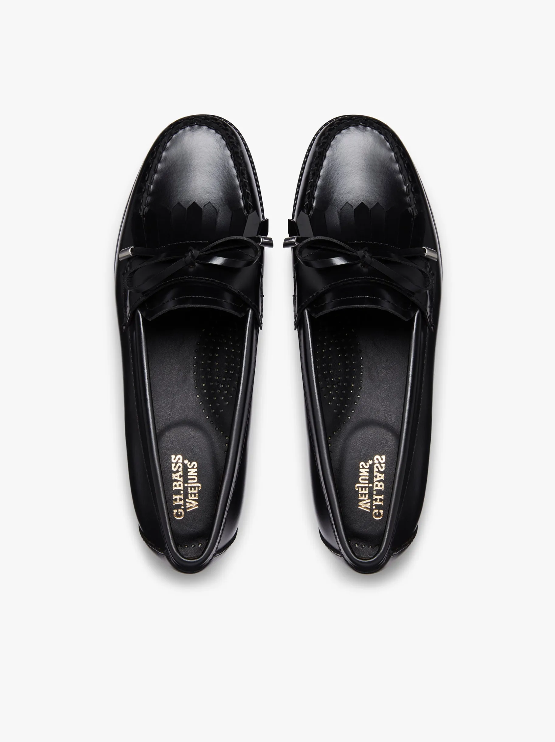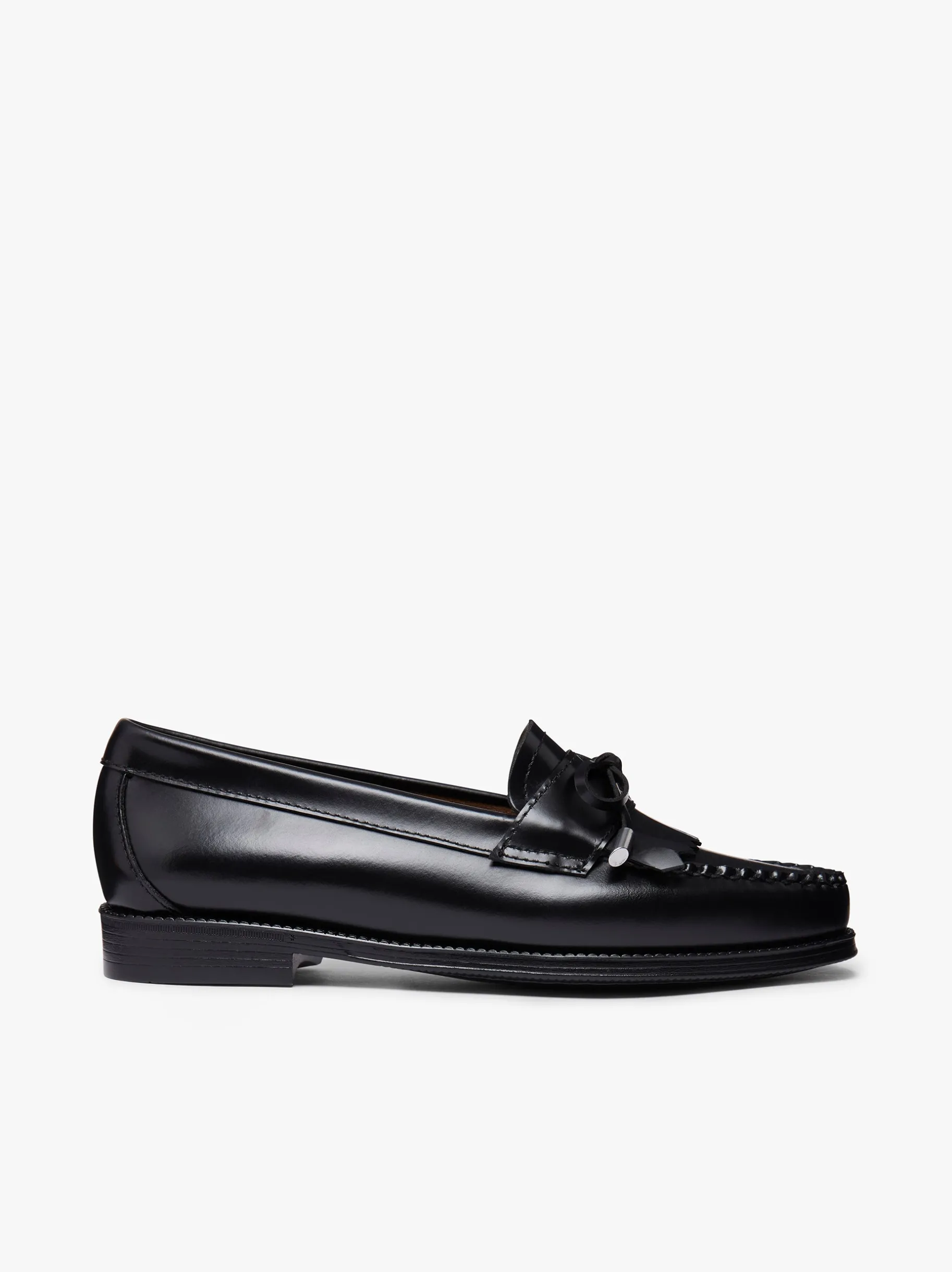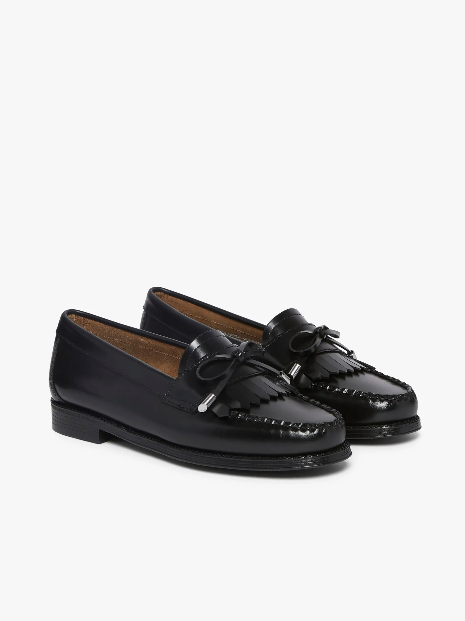 Introducing the Easy Weejuns Esther Bow. Crafted with from a premium black moc leather, these loafers redefine elegance with every step. A dainty bow delicately adorns the vamp, adding a touch of charm and femininity to the classic silhouette. Paired with a playful fringing detail, these loafers are a must-have addition to your wardrobe. Try pairing with tailored trousers and a crisp blouse for a chic office look or with a tailored jumpsuit for a sophisticated yet playful vibe.