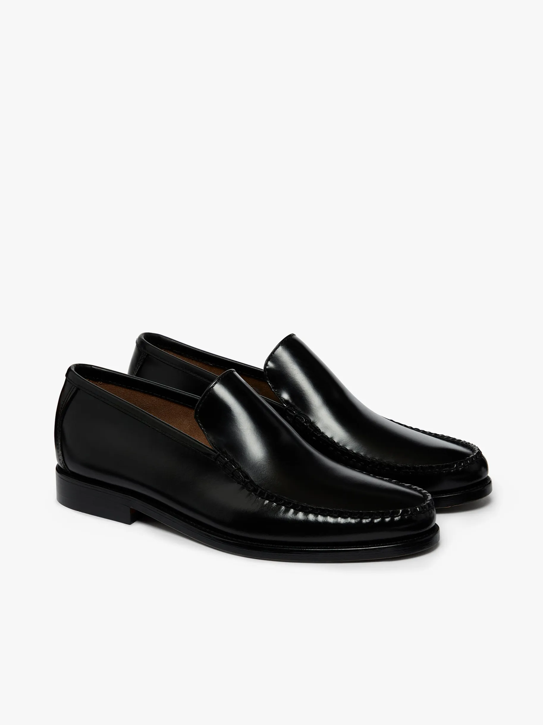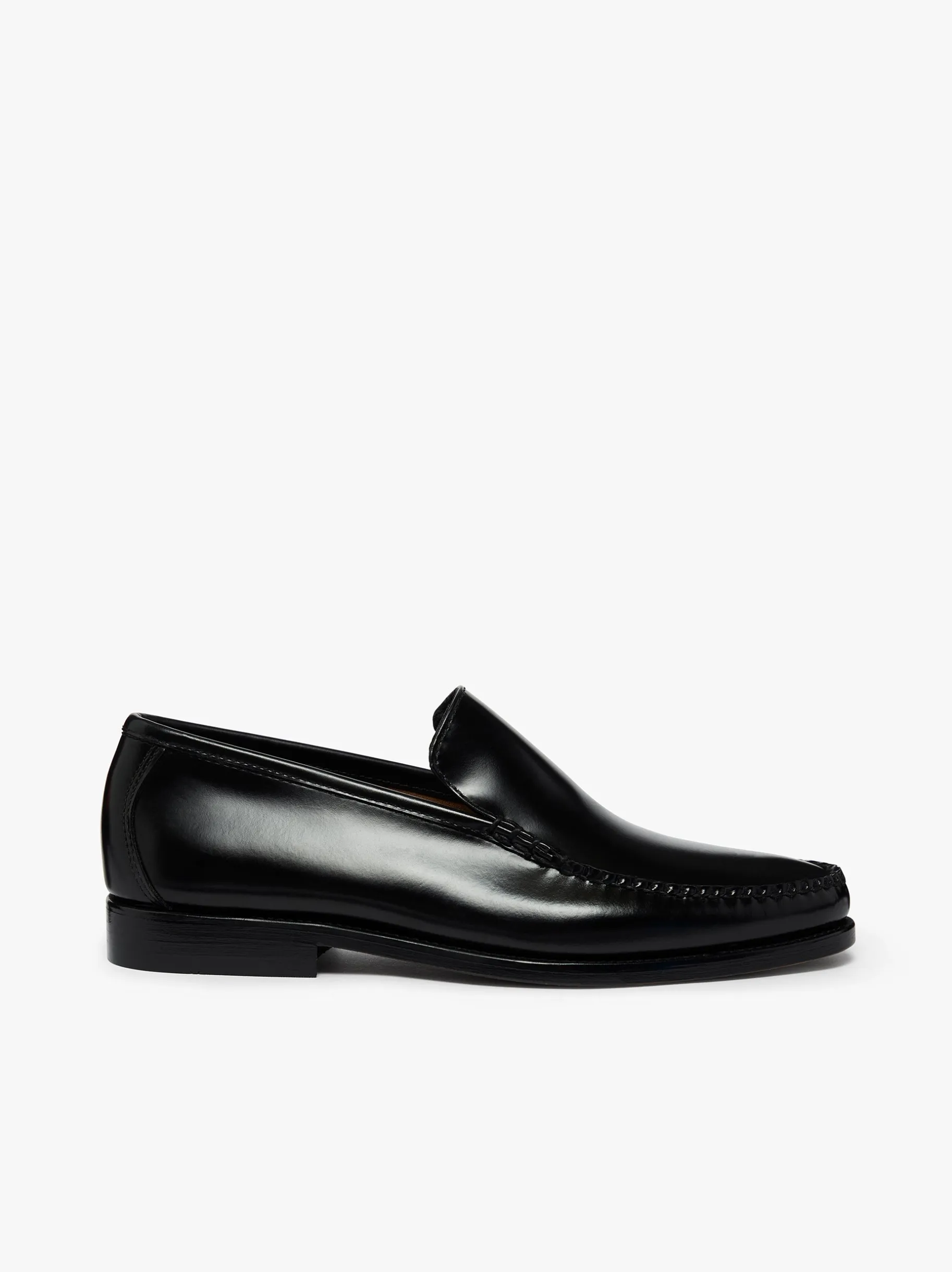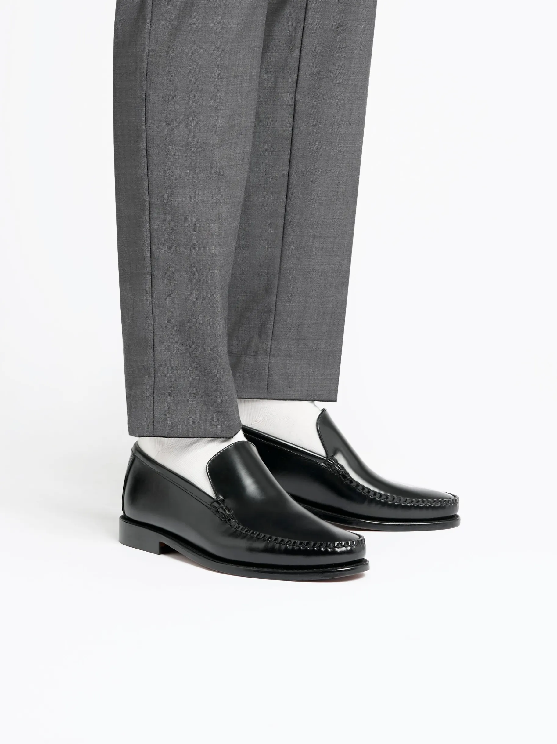 A sleek and minimalist loafer. The Weejuns Cobra venetian is expertly crafted from luxurious, soft black moc leather. Designed to bring sophisticated style to both formal and casual wear. Its lustrous polished finish and tonal stitching create a streamlined look, while the cushioned leather insock provides enhanced comfort. The unlined leather upper offers exceptional breathability, keeping your feet cool and dry. With reinforced stitching on the durable leather outsole, this loafer is handcrafted to last. For timeless style and quality, the Weejuns venetian loafer delivers sophistication with every step.
