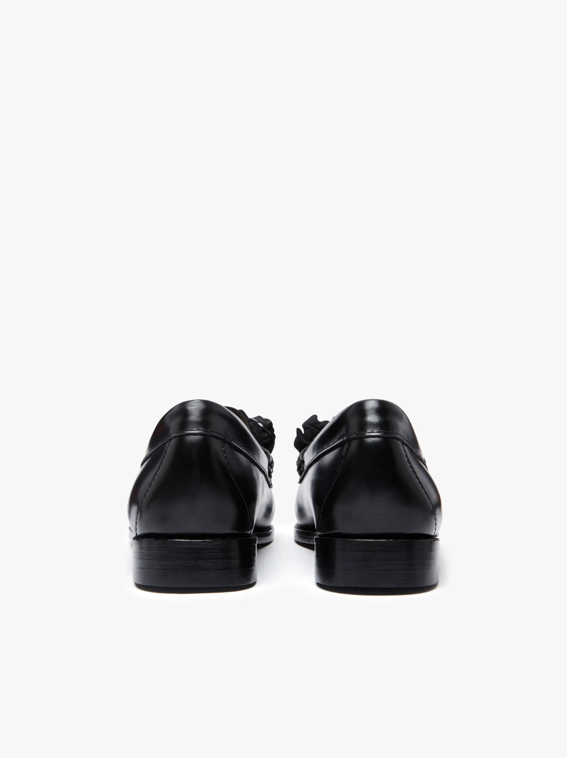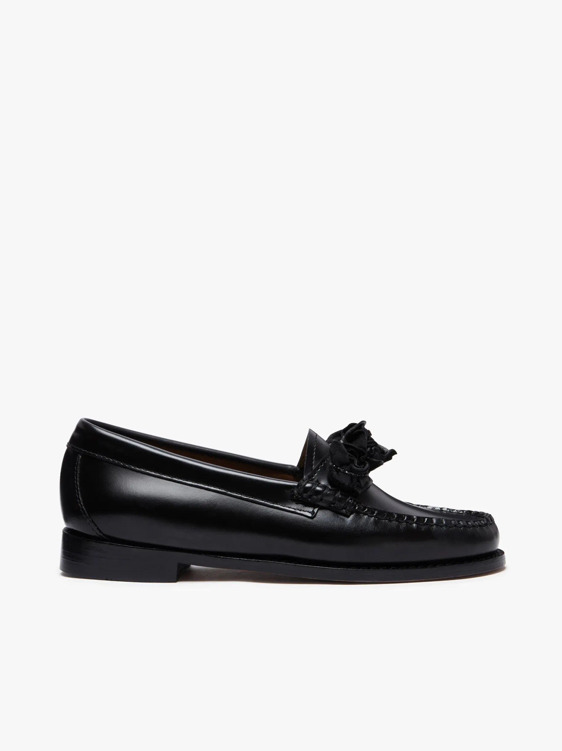 The Weejuns Flora Penny Loafers in black leather feature leather flowers across the penny strap, adding a playful, feminine twist to the classic silhouette. Handcrafted by skilled artisans, a signature of G.H.BASS craftsmanship. A soft cushioned insole provides all-day comfort, while the flexible leather sole offers a smooth, polished finish. Style with tailored trousers for an office-ready look, or pair with a maxi denim skirt and a knitted sweater for a chic weekend outfit.
