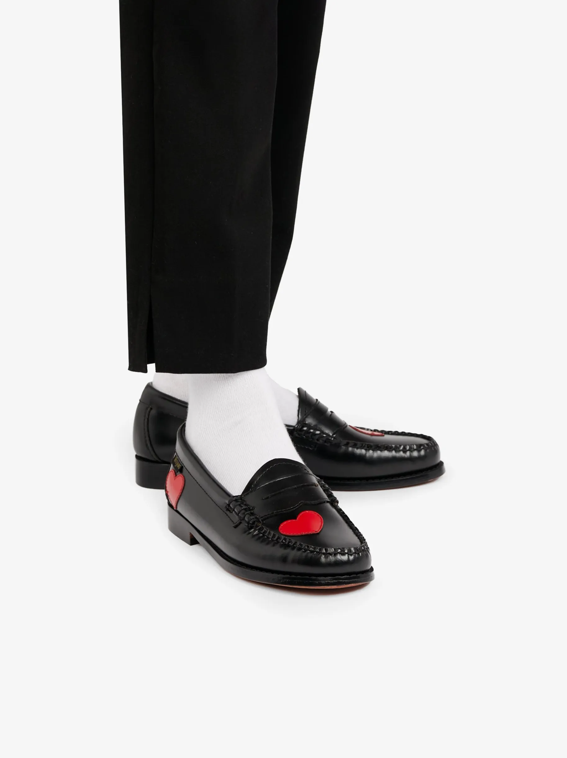 Share the love with the women’s Penny Love Weejuns, the classic black penny loafers with adorable symbolic, leather hearts. In polished black leather, slip-on design and hand-stitched seams. Crafted from premium polished leather, the deep red hue is of the love heart complemented by a sleek black backing for a striking yet sophisticated finish. Perfect for pairing with tailored trousers, casual denim, or even a midi skirt, these black and red leather loafers offer effortless versatility and timeless appeal. We also offer a wide variety of other womens loafers, including colours such as black, brown, tan, navy, white, silver and green.